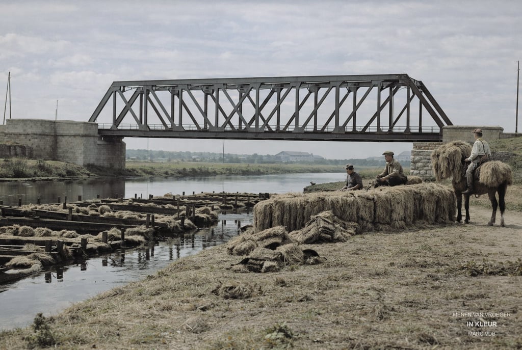 Foto 1 van van na WO1 - De Leie Menen met vlasbewerking en de Ijzeren spoorbrug ong. ter hoogte waar nu Galloo is.