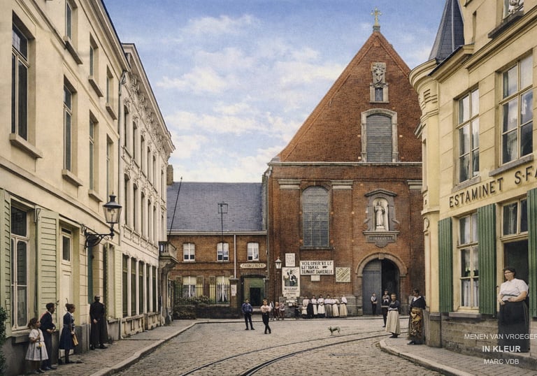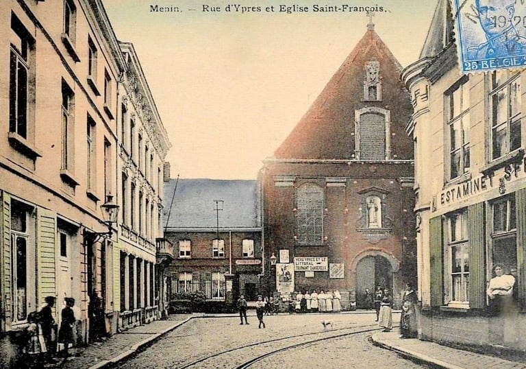Zoals jullie kunnen zien kon je toen slechts in 1 richting rond de kerk. De gebouwen links werden gesloopt in 1936 zodat het verkeer toen in 2 richtingen rond de kerk kon. Rechts Estaminet St-Franciscus, een van de vele cafeetjes toen! Je ziet ook nog het tramspoor lopen. Zoals steeds toen in die tijd veel volk voor de foto! De foto genomen rond 1905