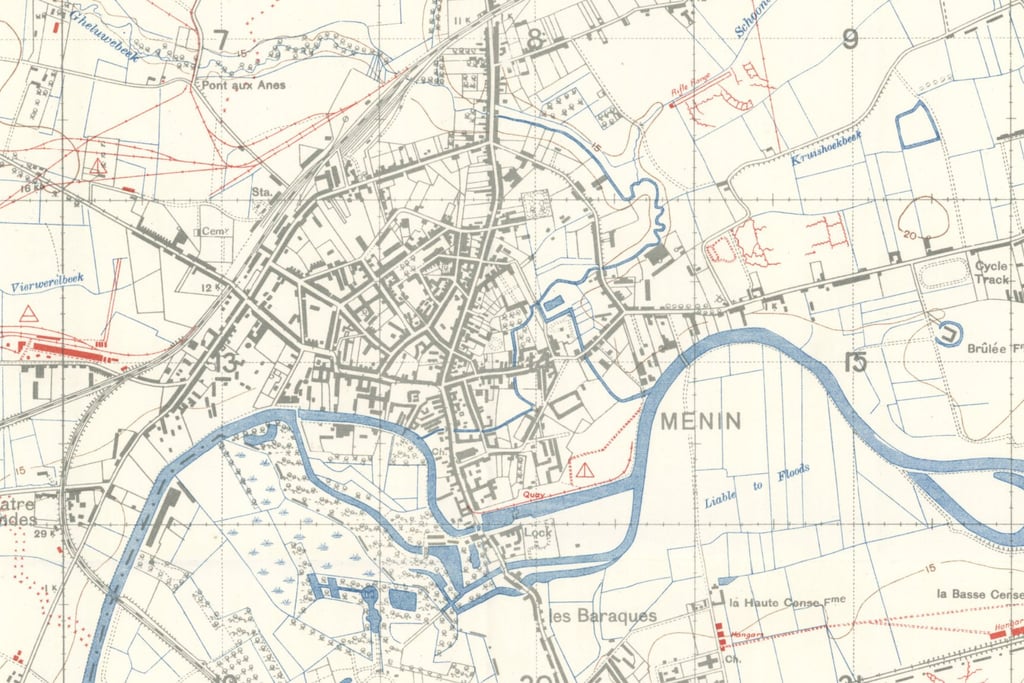 Op deze oude kaart uit 1914 zie je duidelijk uiterst rechts de Vélodrome liggen waar staat "Cycle track". De kaart werd gebruikt door de Britten en is uit het beging van WO1, toen Mene bezet Duits gebied was.