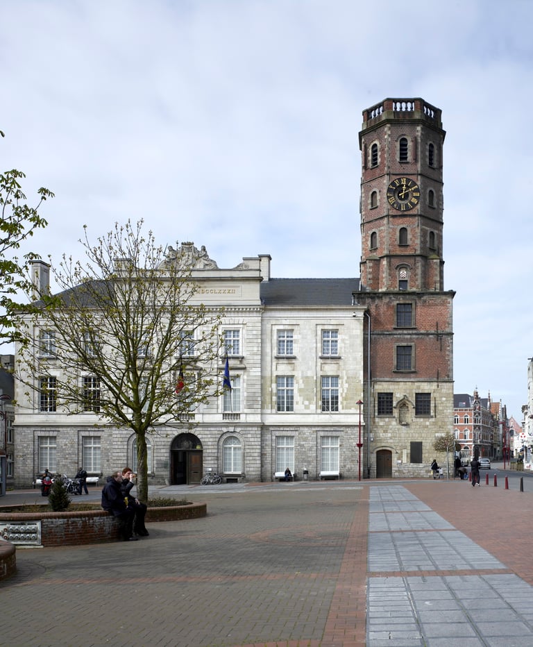 Oorspronkelijk vormden het stadhuis en het belfort één samenhangend bakstenen complex, uitgevoerd in lokale baksteen met natuurstenen accenten. Dit was typerend voor de regionale bouwstijl van de 16de en 17de eeuw.