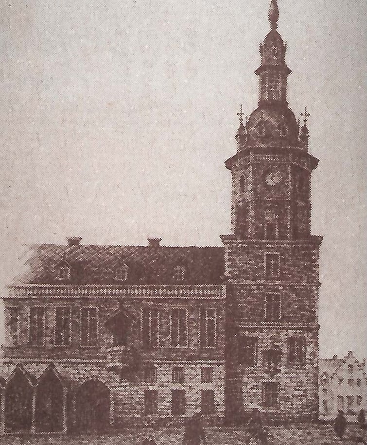 De voorgevel van het stadhuis was eveneens in baksteen uitgevoerd en had een sobere, maar statige uitstraling, met bogen op het gelijkvloers (waarschijnlijk voor markten of openbare doorgangen) en representatieve vertrekken op de verdieping.
