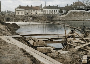 Een bijzonder waardevolle foto toont de opbouw van de gemetselde kaaimuren van het bassin. De boogvormige structuren die zichtbaar zijn, maken deel uit van de constructieve versterking van deze kaaimuren. Het gaat hier niet om een brug, maar om een essentieel onderdeel van de waterbouwkundige infrastructuur die het bassin moest afbakenen en verstevigen.