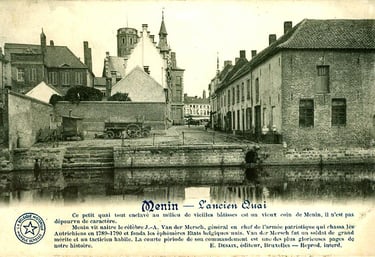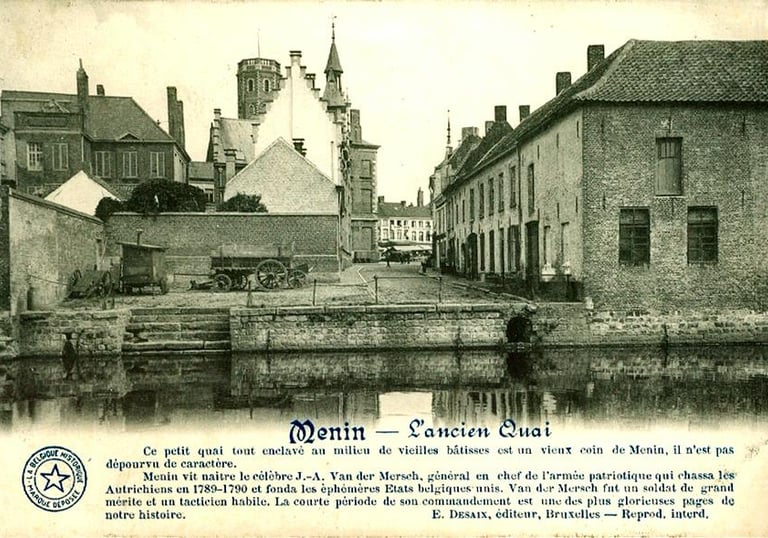 Deze ingekleurde foto uit 1899 werpt een zeldzaam en sfeervol licht op het oude stadsweefsel van Menen. We kijken richting de Grote Markt, met het belfort dat net boven de daken uitsteekt, als trotse wachter van de stad. Op de voorgrond glinstert de Leie — toen nog een levendige levensader die dwars door het centrum stroomde, op amper 150 meter van de Grote Markt.