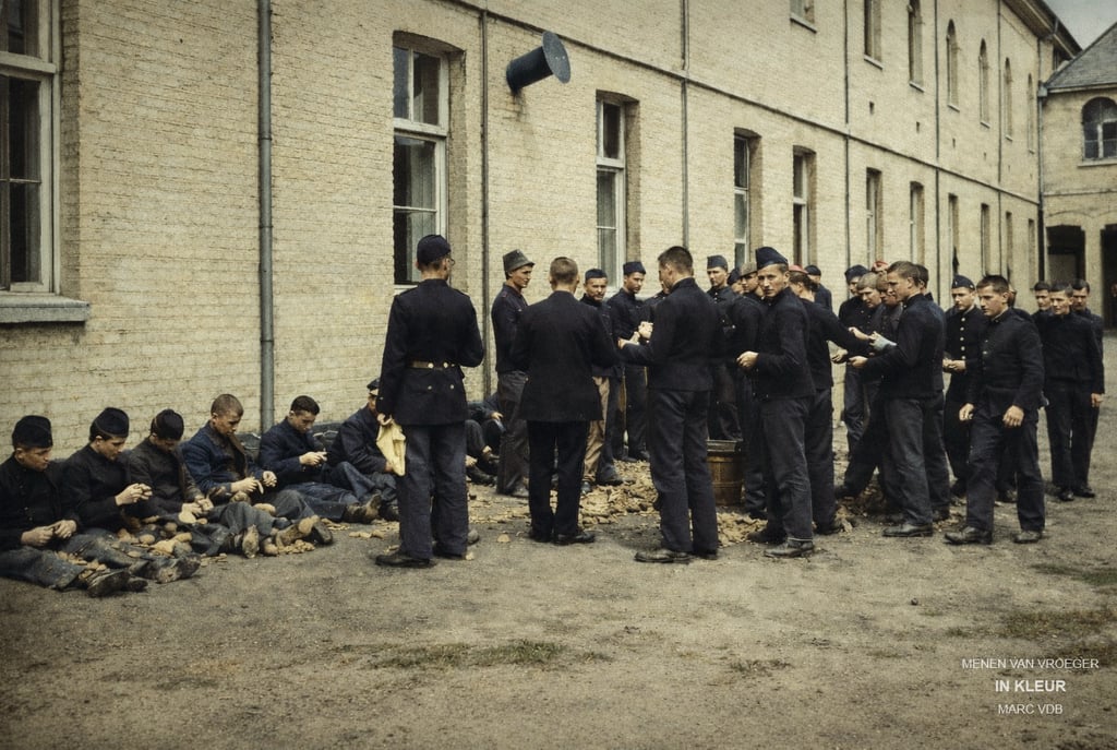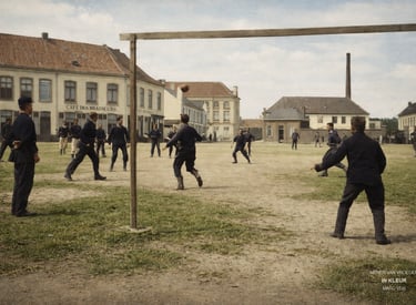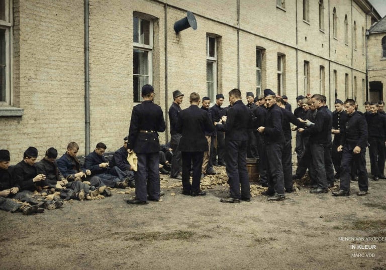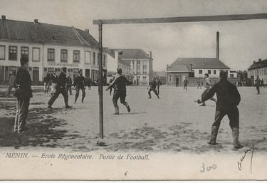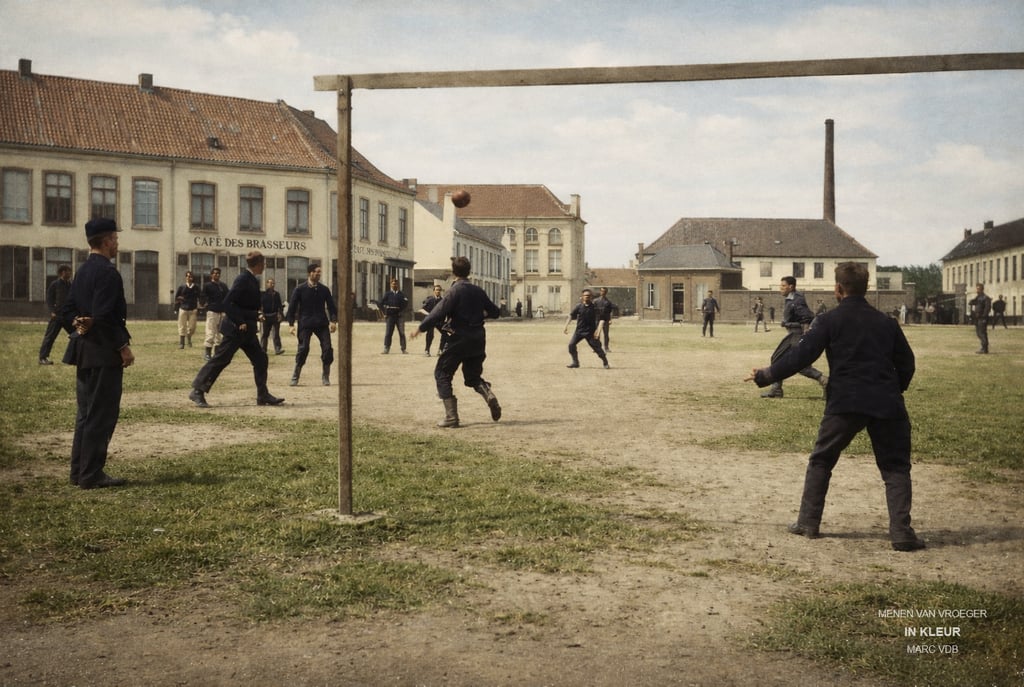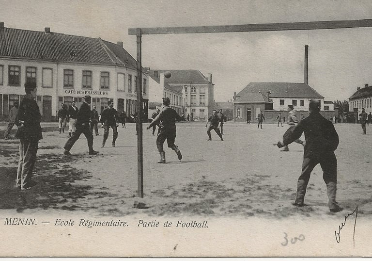 Op deze foto uit circa 1905 zien we een groep Belgische soldaten die een partijtje voetbal spelen op het open plein voor de kazerne van Menen. Op het eerste gezicht een onschuldig moment van ontspanning, maar in werkelijkheid een bijzonder waardevol historisch document. Dankzij aanvullend beeldmateriaal weten we vandaag precies wie deze soldaten waren en welke rol Menen toen speelde binnen het Belgische leger.