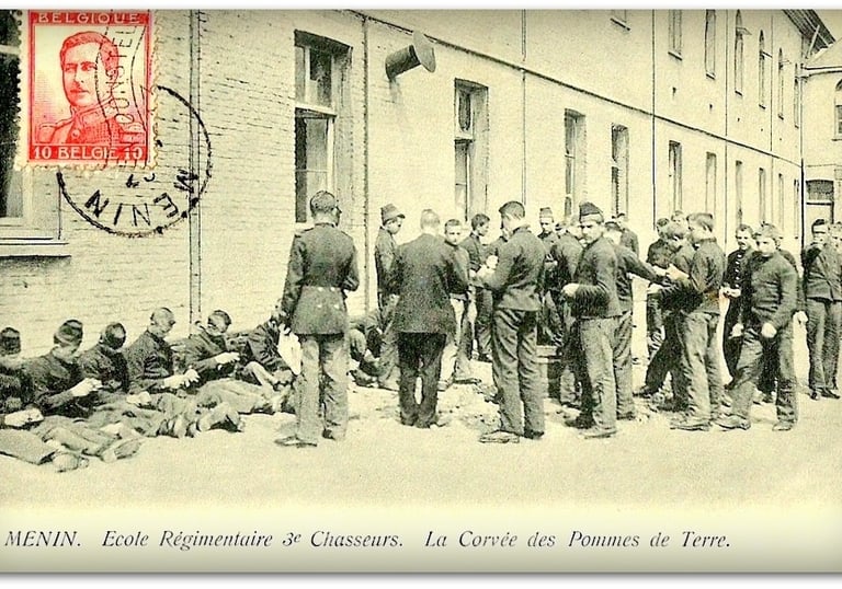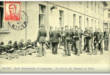 “MENIN. École Régimentaire 3e Chasseurs. La corvée des pommes de terre.”