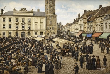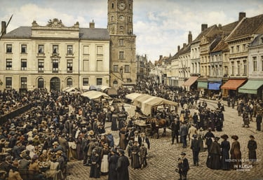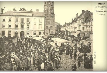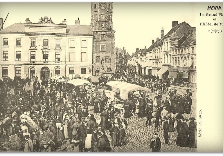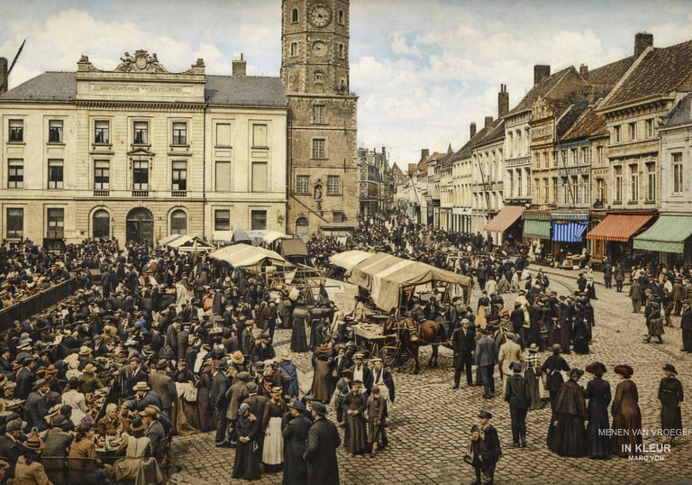 Deze indrukwekkende foto toont de Grote Markt van Menen in het begin van de 20e eeuw, op een moment waarop de stad zichtbaar bruist van leven. Op het eerste gezicht lijkt het een gewone wekelijkse markt, maar wie beter kijkt, merkt meteen dat hier meer aan de hand is dan louter handel. De massa volk, de gevulde cafés, de ontspannen sfeer en de feestelijke aankleding doen sterk vermoeden dat dit een bijzondere marktdag of feestdag was.