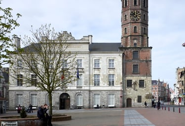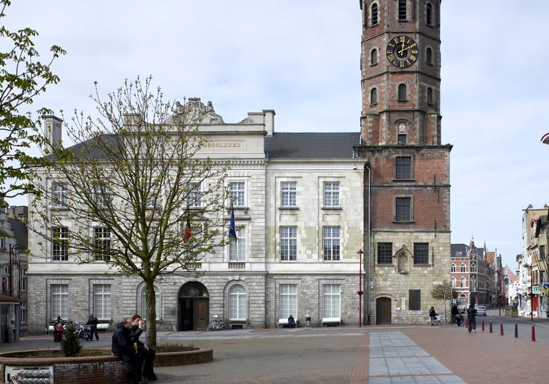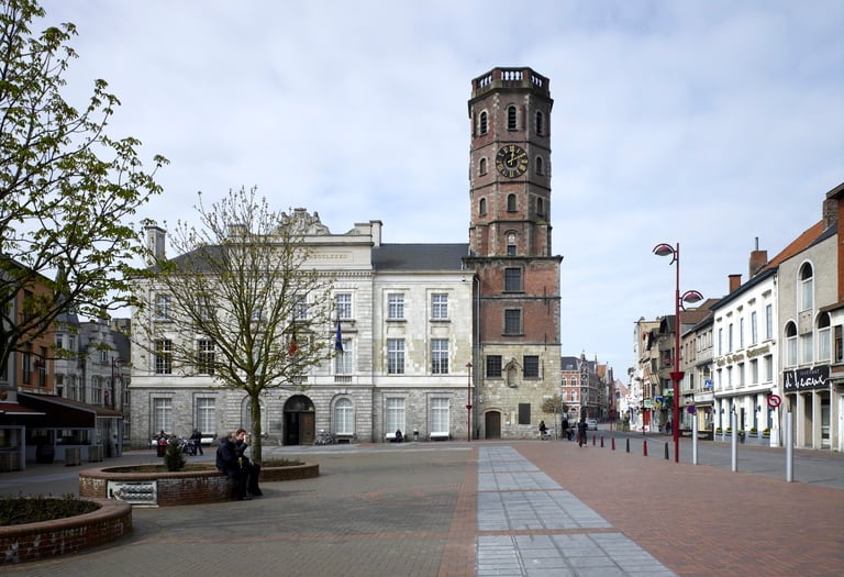 De imposante achtergrond van het Stadhuis en het Belfort, samen met de statige handelspanden met hun kleurrijke luifels, onderstreept het belang van deze plek in het stedelijke leven.
